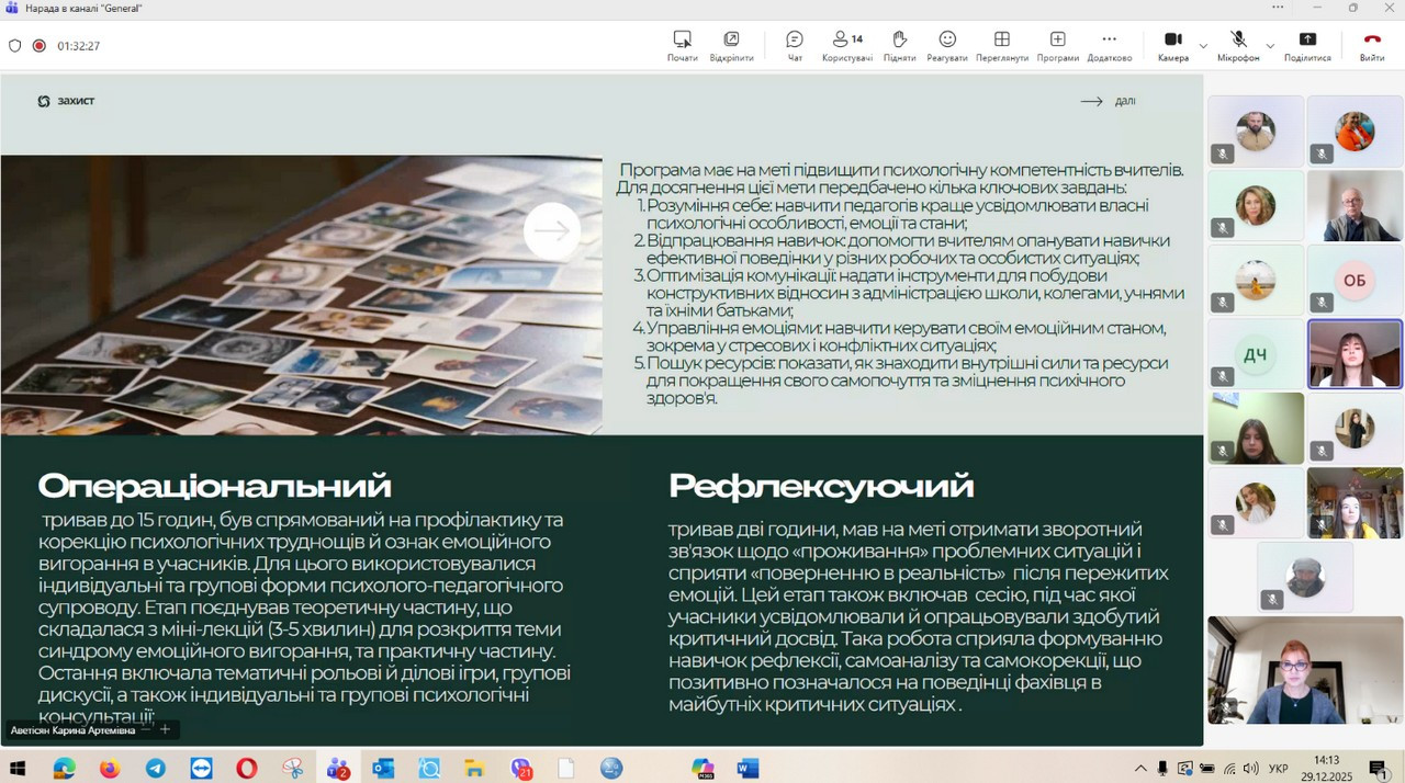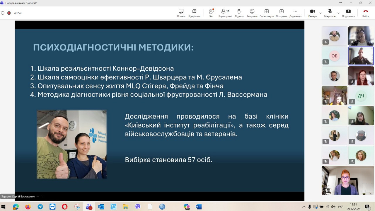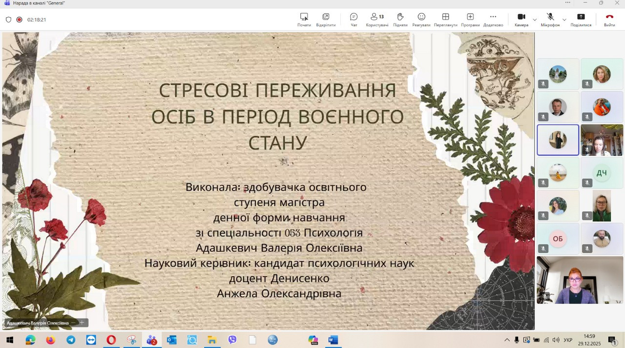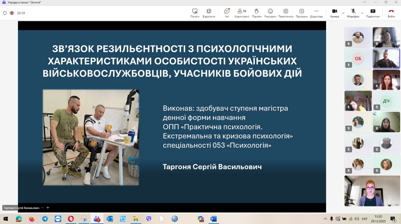 29 грудня 2025 року відбувся захист кваліфікаційних (магістерських) робіт здобувачів денної форми навчання за зазначеною освітньо-професійною програмою. Представлені магістерські дослідження продемонстрували високий рівень інтеграції теоретичних положень сучасної психологічної науки з практичними завданнями професійної діяльності психолога в умовах підвищеного стресу, невизначеності та соціальних трансформацій, зумовлених воєнним станом. Зміст робіт охоплював широкий спектр проблем, пов’язаних із психологічним супроводом особистості в кризових та екстремальних умовах, дослідженням адаптаційних можливостей, стресостійкості та ресурсного потенціалу людини, а також розробкою й апробацією практичних моделей психологічної допомоги різним категоріям населення. Особливий акцент було зроблено на аналітичному осмисленні складних психологічних феноменів, умінні обґрунтовувати вибір методів психодіагностики та психокорекції, а також на професійній рефлексії результатів власного дослідження. За результатами захисту підтверджено, що випускники денної форми навчання за освітньо-професійною програмою «Практична психологія. Екстремальна та кризова психологія» досягли програмних результатів навчання, які передбачають здатність аналізувати та інтерпретувати поведінку людини в екстремальних ситуаціях, прогнозувати психологічні наслідки дії кризових чинників, ефективно організовувати професійну взаємодію та приймати відповідальні рішення в умовах підвищеної напруги. Магістранти продемонстрували готовність до надання кваліфікованої психологічної допомоги особистості у кризовому стані, спрямованої на мобілізацію її внутрішніх ресурсів, підтримку життєстійкості та психологічного відновлення, зокрема в умовах війни.