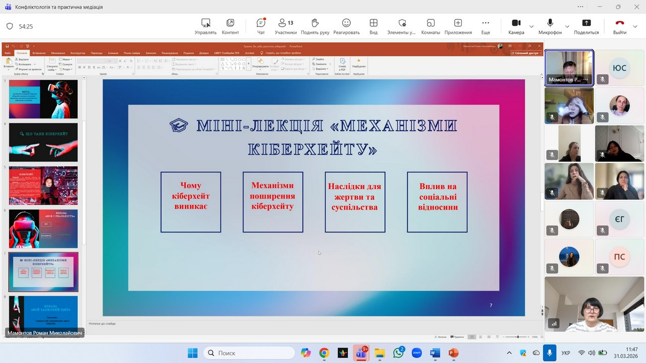 31 березня в онлайн форматі відбувся тренінг «Як себе захистити від кіберхейту» у рамках Міжнародного проєкту DAAD-57834338 «Транснаціональні освітні та дослідницькі стратегії проти цифрової ненависті – 2026» (Німеччина, Україна, Молдова, Киргизстан). Тренінг провів магістрант 1 курсу спеціальності Прикладна та практична психологія Інституту психології та суспільних наук Університету Ушинського Роман Мамонтов за підтримки медіатора Ірини Бринзи. Метою тренінгу стало розвінчання поширених міфів про кіберхейт, навчання учасників критичному мисленню та вмінню розпізнавати небезпечні установки У програмі також було застосовано міні-лекцію «Механізми кіберхейту» та інтерактивні вправи, спрямовані на формування розуміння явища цифрової ненависті та практичні навички протидії йому.