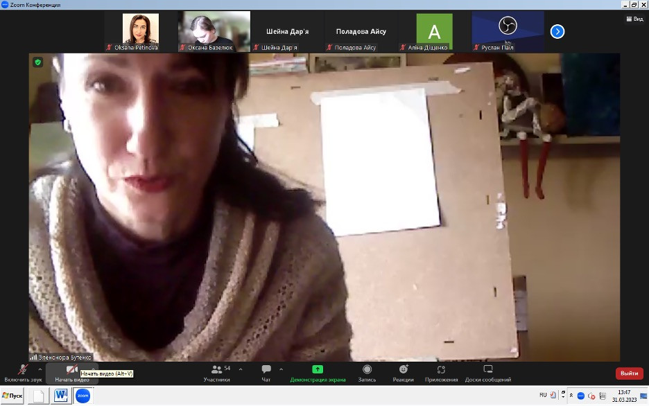 31 березня 2023 року здобувачка третього (освітньо-наукового) рівня вищої освіти ОНП «Філософія» Елеонора Бутенко в рамках проходження науково-педагогічної практики провела відкритий виховний захід та майстер-клас «Розвиток творчої особистості методом арт-терапії: філософія мистецтва».У заході взяли участь студенти соціально-гуманітарного факультету ОПП «Менеджмент соціокультурної діяльності», «Філософія» та студенти 1-го і 4-го курсу факультету початкового навчання ОПП «Початкова освіта. Логопедія», «Початкова освіта. Англійська мова», «Початкова освіта. Практична психологія»; члени наукового гуртка «Південноукраїнські наукові студії». До заходу також долучилися науково-педагогічні працівники: гарант ОНП «Філософія» проф. Оксана Петінова, член групи забезпечення ОНП «Філософія» доц. Галина Врайт; а також викладач музичного мистецтва доц. Наталія Батюк.