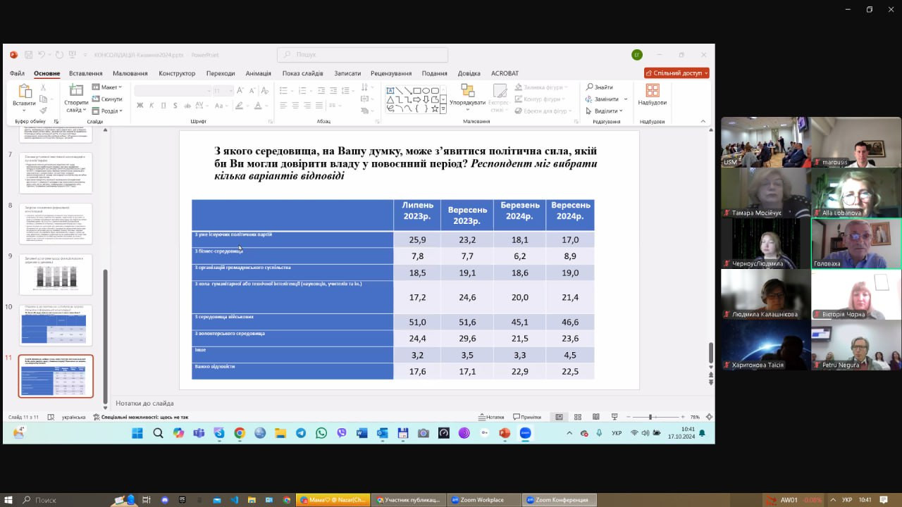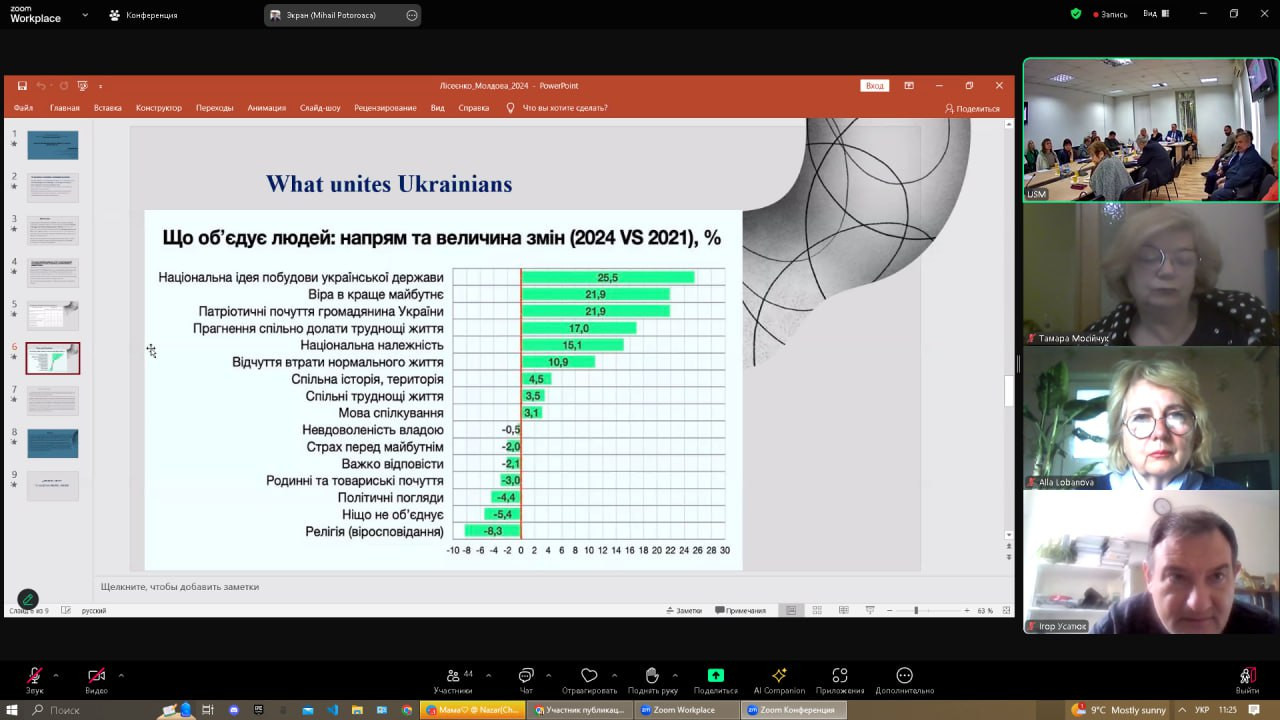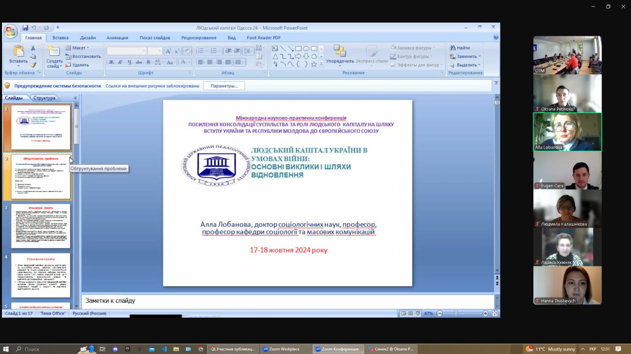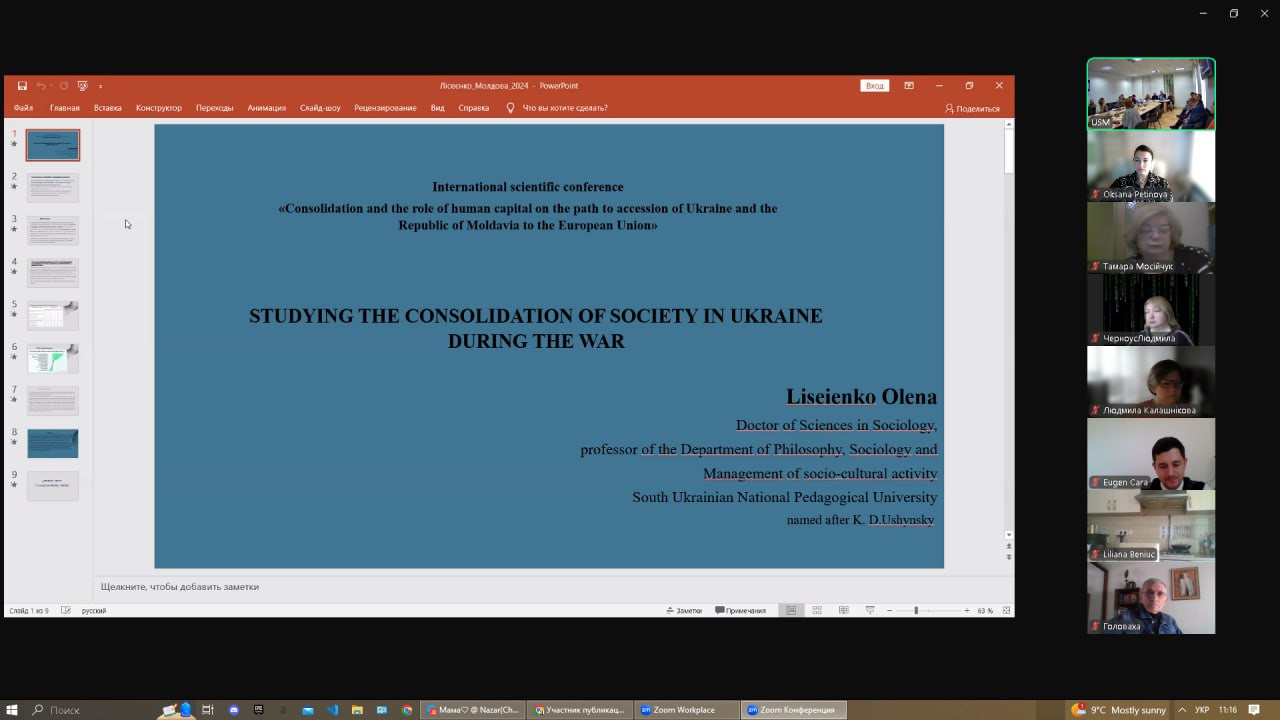 17-18 жовтня 2024 року в змішаному форматі (онлайн/офлайн) відбулася щорічна Міжнародна науково-практична конференція «Посилення консолідації суспільства та ролі людського капіталу на шляху вступу України та республіки Молдова до Європейського Союзу», організаторами якої є кафедра філософії, соціології та менеджменту соціокультурної діяльності Університету Ушинського (завідувач – проф. Євген Борінштейн), Південноукраїнське відділення Соціологічної асоціації України (голова – проф. Олена Лісеєнко), Асоціація соціологів та демографів Молдови (президент – доктор соціології Віктор Мокану).До участі в конференції долучилися науковці Інституту соціології НАН України, Центра Соціології та Соціальної психології Кишинівського державного університету Республіки Молдова, викладачі вищих навчальних закладів Києва, Одеси, Харкова, Кривого Рогу, здобувачі вищої освіти різних рівнів та спеціальностей.