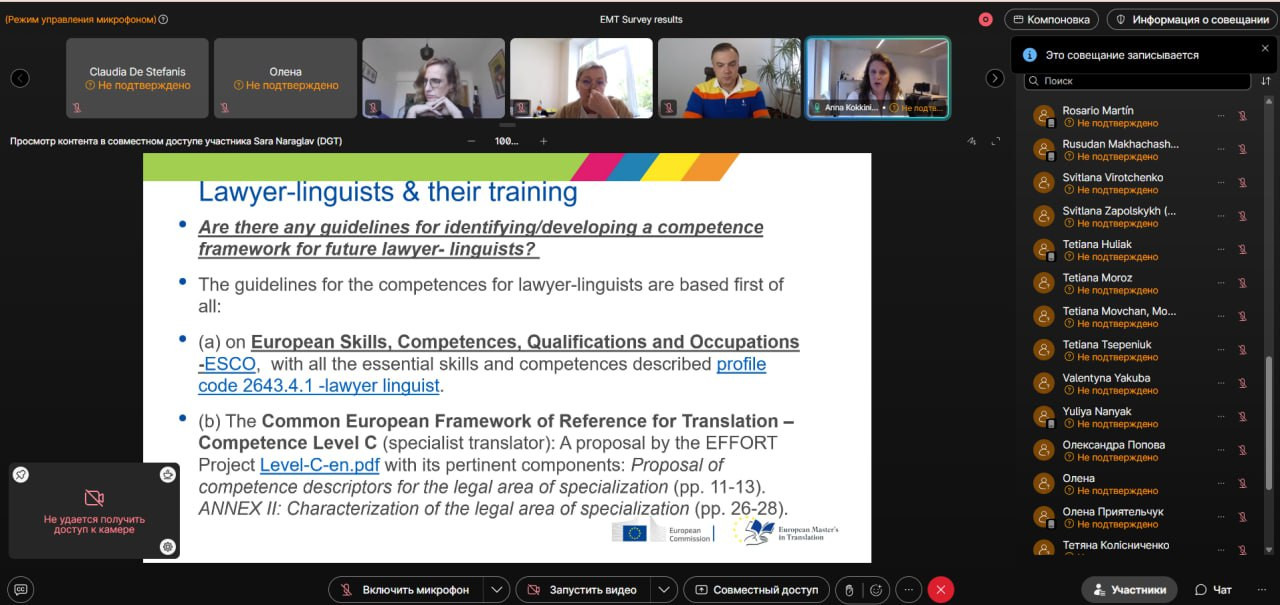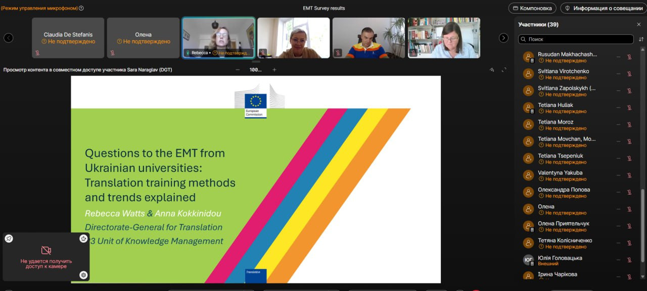 Захід розпочався із вітального слова заступниці керівника відділу координації та інституційних справ Генерального директорату з питань перекладу Європейської Комісії пані Клаудії Де Стефаніс. Далі з українськими університетами поспілкувалися політичні офіцери відділу управління знаннями пані Ребекка Ваттс та пані Анна Коккініду, які представили сучасні методи та тенденції у сфері підготовки перекладачів, а також відповіли на запитання учасників.