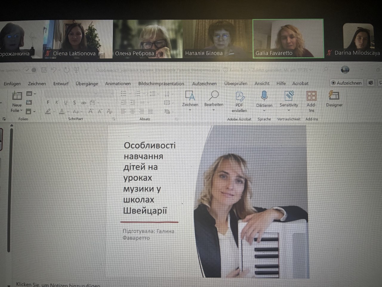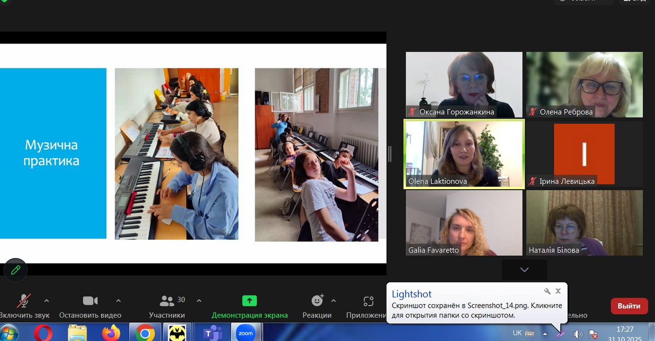 Згідно плану заходів з євроінтеграції в ННІМПМСП 31 жовтня 2025 року було проведено онлайн-зустріч з випускницями факультету музичної та хореографічної освіти, що працюють за спеціальністю в країнах Європи. Зустріч була дуже цікавою і продуктивною як для майбутніх спеціалістів, так і для аспірантів. Своїм практичним досвідом роботи у європейських освітніх системах поділилися випускниці факультету Олена Лактіонова (Німеччина) та Галина Фаваретто (Швейцарія). Здобувач усіх рівнів вищої освіти, що навчаються за спеціальностями Середня освіта (Музичне мистецтво) (А4) та Музичне мистецтво (В5), а також аспіранти, що навчаються на ОНП «Мистецька педагогіка вищої освіти» мали чудову нагоду з перших вуст дізнатися про європейський досвід навчання музичного мистецтва, порівняти методики його викладання та розширити свій професійний світогляд.