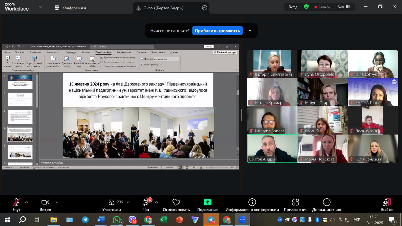 В рамках конференції пройшов круглий стіл «Робота Центрів психологічної стійкості та благополуччя» в рамках реалізації проєкту Erasmus+ KA2 «Boosting University Psychological Resilience and Wellbeing in (Post-) War Ukrainian Nation» (BURN), напрям Capacity building in the field of higher education (Розвиток потенціалу у сфері вищої освіти) ID 101129379, у якому прийняв участь керівник Науково-практичного центру ментального здоров’я Університету Ушинського Андрій БОРТОВ з доповіддю «Інтеграція освіти, науки, практики та волонтерських ініціатив у роботі Науково-практичного центру ментального здоров’я Університету Ушинського».