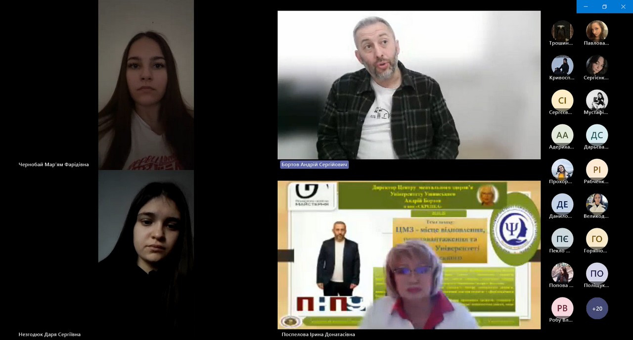 20 листопада до науково-дослідної лабораторії тренінгових технологій «Скрепка», що створена на базі кафедри теорії та методики практичної психології Навчально-наукового інституту психології та суспільних наук Університету Ушинського, завітав на онлайн-зустріч директор Центру ментального здоров’я, практичний психолог з 10-річним досвідом роботи, тренер, асистент кафедри загальної та диференціальної психології Університету Ушинського Андрій Сергійович Бортов.