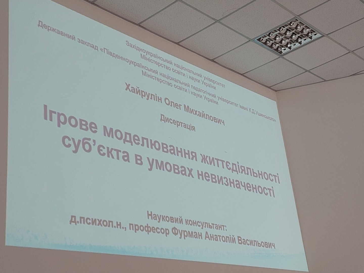 22 листопада 2025 року у постійно діючій спеціалізованій вченій раді Д41.053.03 при Державному закладі «Південноукраїнський національний педагогічний університет імені К. Д. Ушинського відбувся успішний захист дисертації Хайруліна Олега Михайловича на тему : “Ігрове моделювання життєдіяльності суб’єкта в умовах невизначеності” на здобуття наукового ступеня доктора психологічних наук зі спеціальності 19.00.01 - загальна психологія, історія психології.