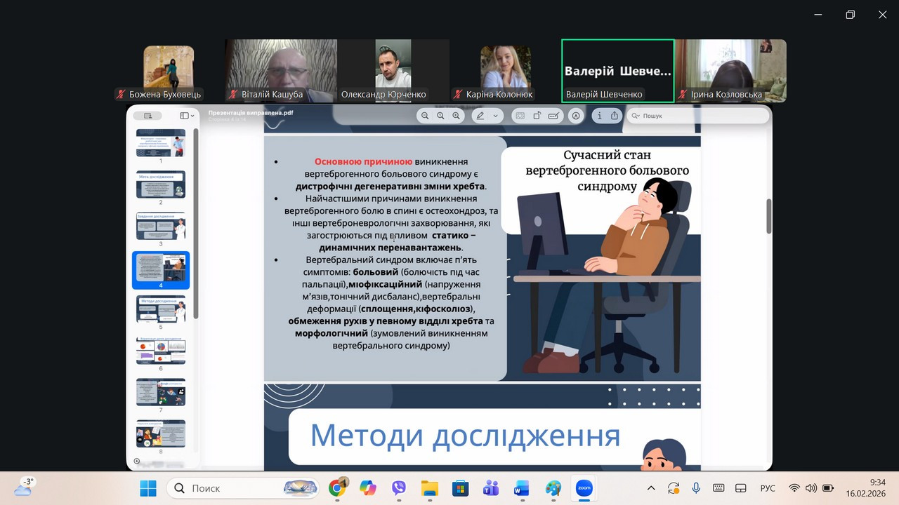 16 лютого 2026 року науковий керівник проблемної групи «Фізкультурно-спортивна реабілітація», д-р наук з фіз. виховання і спорту, доцент кафедри гімнастики та фізкультурно-спортивних технологій Буховець Божена та члени проблемної групи здобувачі другого (магістерського) рівня вищої освіти спеціальності А7 Фізична культура та спорт прийняли участь у науковій онлайн-платформі здобувачів вищої освіти кафедри кінезіології та фізкультурно-спортивної реабілітації Національного університету фізичного виховання і спорту України «Фізкультурно-спортивна реабілітація крізь призму сучасних дипломних досліджень».