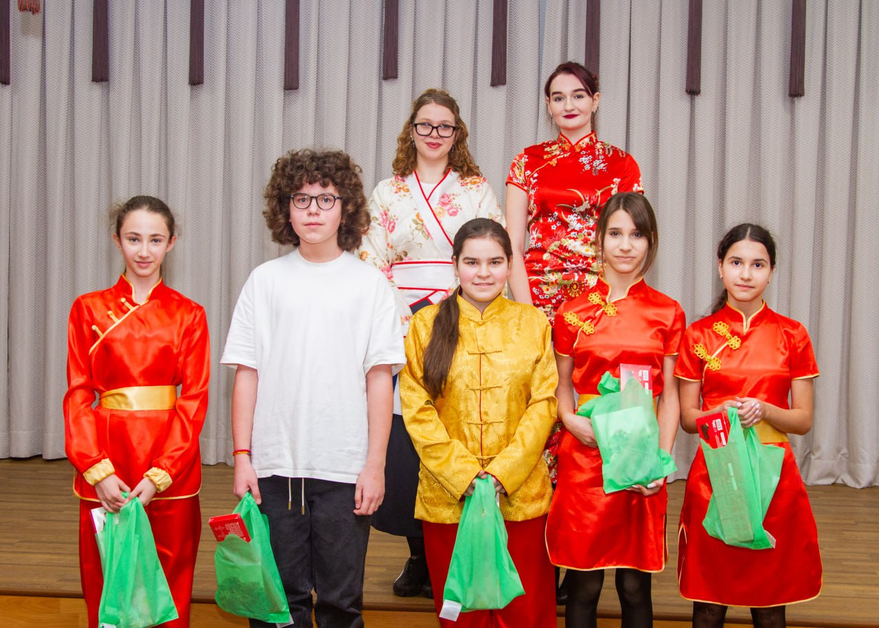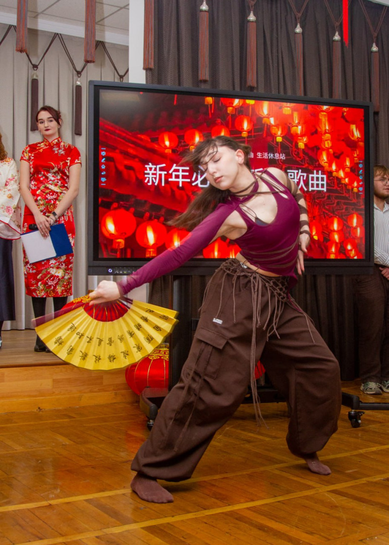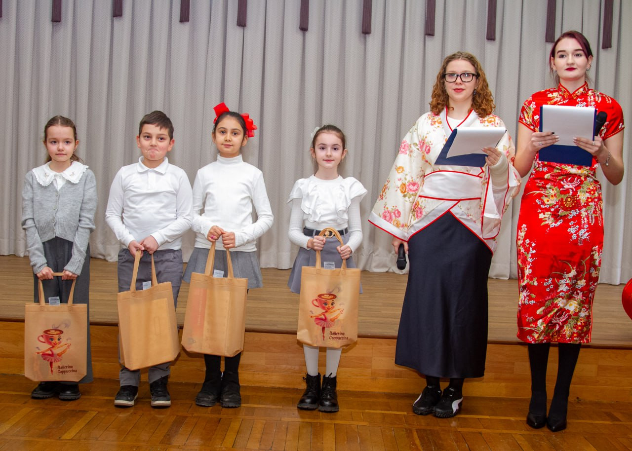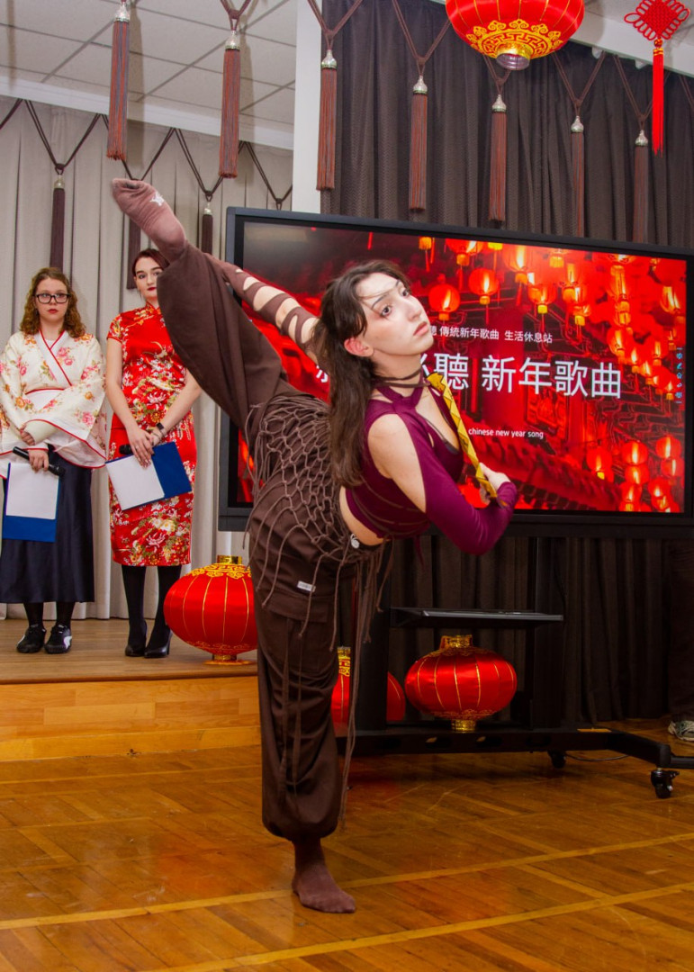 Учні 2-А класу представили мнемонічні вірші про тварин китайського гороскопу, а справжньою окрасою концерту став сольний номер «Танець шовкових хвиль» (Sī bō wǔ) у виконанні учениці 11-А класу Вікторії Унанян.