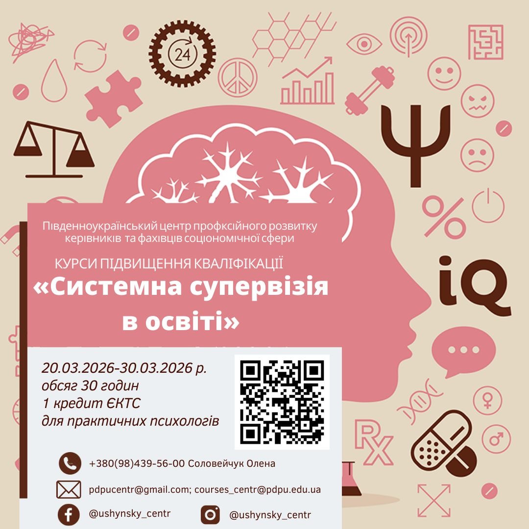 Увага! Оголошується реєстрація на курси підвищення кваліфікації за програмою: «Системна супервізія в освіті»(для практичних психологів) 20.03.2026 р.- 30.03.2026 р., обсягом 30 годин, вартість - 650 гривень
