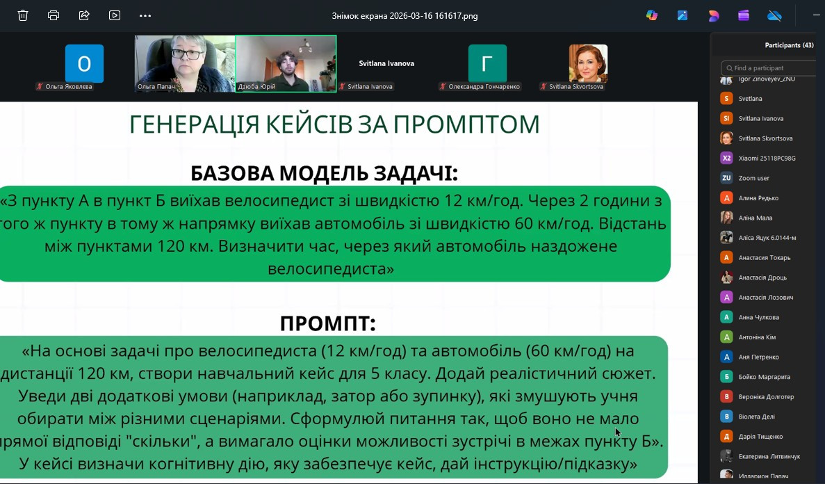 В межах святкування Міжнародного дня математики 16 березня 2026 року на базі навчально-наукового інституту природничо-математичних наук, інформатики та менеджменту кафедрою вищої математики і статистики та кафедрою математики і методики її навчання був організований науково-методичний воркшоп, присвячений актуальним питанням трансформації математичної освіти в умовах цифровізації. Ключовою темою заходу став розгляд методики проєктування математичних кейсів засобами штучного інтелекту як чинника розвитку когнітивної гнучкості учнів 5-9 класів. На заході було презентовано результати спільного дослідження доцента Ольги Папач та студента 4 курсу групи МІ41 Юрія Дзюби та обґрунтовано роль математики як універсального інструменту деавтоматизації мислення. Особливий акцент було зроблено на важливості формування в учнів здатності до стратегічного вибору методів розв’язання задач у ситуаціях методичної невизначеності.