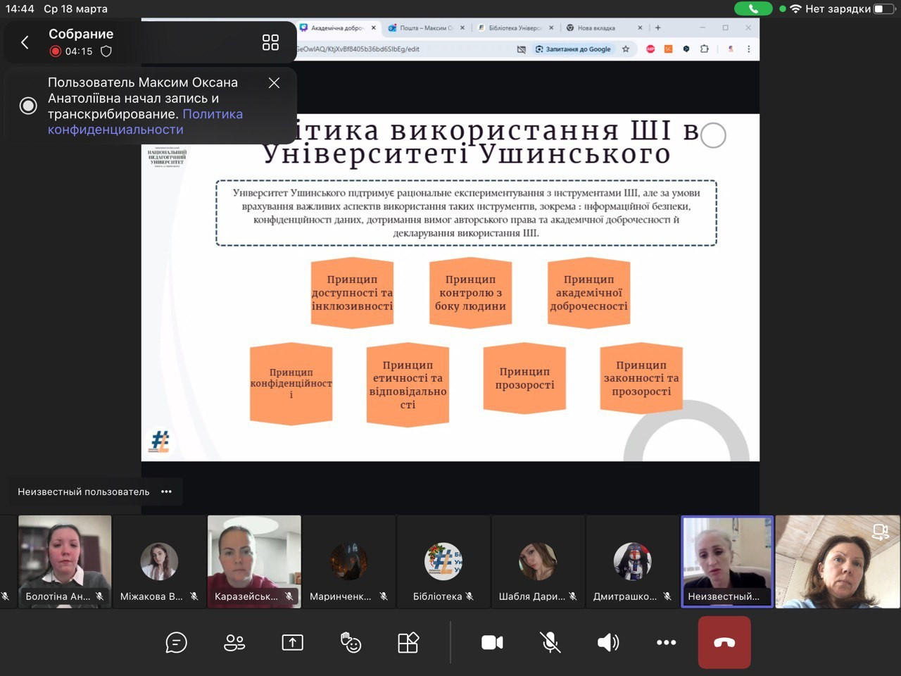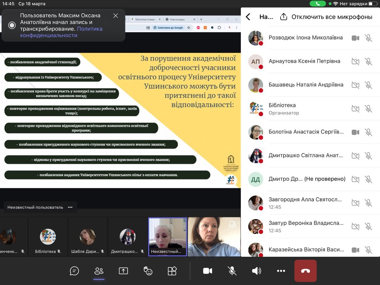 Крім того, на платформі Microsoft Teams відбулася зустріч на тему «Інструменти та способи мотивування здобувачів вищої освіти до доброчесної поведінки». Учасники обговорили ефективні підходи до формування академічної культури, підвищення відповідальності студентів та запобігання порушенням принципів доброчесності.
