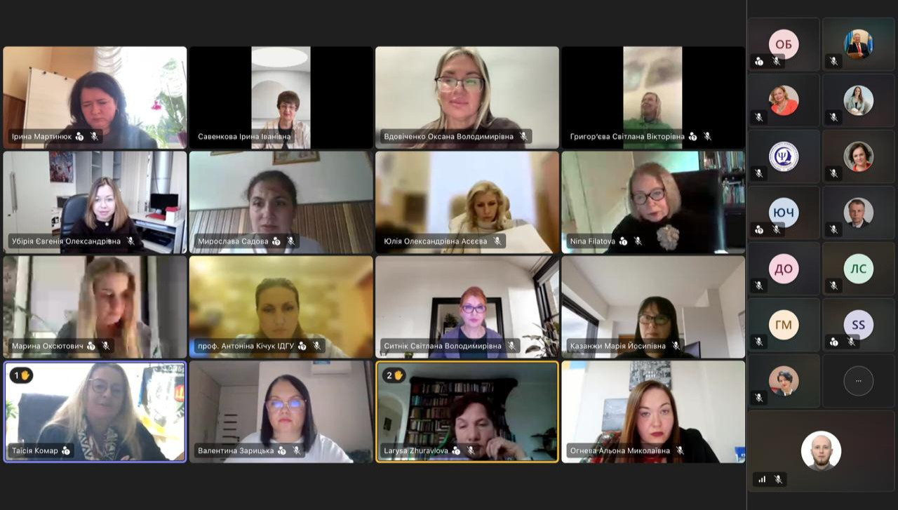 До зустрічі доєдналися стейкголдери Олена КУДЕРМІНА (доктор психологічних наук, професор, Національна академія внутрішніх справ, заступник голови науково-методичної підкомісії сектору вищої освіти Науково-методичної ради Міністерства освіти і науки України зі спеціальності С4 Психологія); Таїсія КОМАР (доктор психологічних наук, професор, завідувач кафедри психології та педагогіки, Хмельницький національний університет, член науково-методичної підкомісії сектору вищої освіти Науково-методичної ради Міністерства освіти і науки України зі спеціальності С4 Психологія); Юлія АСЄЄВА (доктор психологічних наук, професор, академік НАН ВО України, завідувач кафедри мовної та психолого-педагогічної підготовки, Одеський національний економічний університет, психотерапевт); Мирослава САДОВА (доктор психологічних наук, професор, Національний університет біоресурсів і природокористування України; провідний науковий співробітник відділу психології праці інституту педагогічної освіти та освіти дорослих НАПН України, провідний науковий співробітник факультету психології Пан-Європейського університету (Братислава, Словаччина), академічний радник Глобального міжрелігійного університету (штат Делівер, США)); Ірина МАРТИНЮК (кандидат психологічних наук, доцент, завідувач кафедри психології Національний університет біоресурсів і природокористування України); Валентина ЗАРИЦЬКА (доктор психологічних наук, професор, Мелітопольський державний педагогічний університет імені Богдана Хмельницького); Інга ПЕТРОВСЬКА (доктор психологічних наук, професор, Львівський національний університет імені Івана Франка); Ольга ЛИТВИНЕНКО (доктор психологічних наук, професор, Одеський національний медичний університет, майстер-тренер, психотерапевт, член ради директорів WAPP, головний редактор журналу «The Global Psychotherapist»); Каріна ФОМЕНКО (доктор психологічних наук, професор, Харківський національний педагогічний університет імені Г.С.Сковороди); Антоніна КІЧУК (доктор психологічних наук, професор, Ізмаїльський державний гуманітарний університет); Вікторія ОВЕРЧУК (доктор економічних наук, кандидат психологічних наук, професор, директор навчально-наукового інституту психології Донецького національного університету імені Василя Стуса); Лариса ЖУРАВЛЬОВА (доктор психологічних наук, професор, Поліський національний університет); Марина ОКСЮТОВИЧ (кандидат філософських наук, доцент, завідувач кафедри психології та соціального забезпечення ДЗ «Житомирська політехніка»); Ніна ФІЛАТОВА (практичний психолог Одеського юридичного ліцею, тренер-фасилітатор програми тренінгів в Україні від Ізраїльської коаліції травми (ITC), тренерка Одеського центру стресостійкості, член Асоціації кіберпсихологів України); Ганна Велічко (завідувачка відділу психосоціальної підтримки та ментального здоров’я Одеського обласного медичного центру психічного здоров’я, регіональна консультантка Координаційного центру з розвитку сімейного виховання та догляду дітей, регіональна координаторка Всеукраїнської програми ментального здоровʼя «Ти як?»); Євгенія УБІРІЯ (завідувач психолого-педагогічним відділенням реабілітаційного центру імені Бориса Літвака «Майбутнє»); Світлана ГРИГОР’ЄВА (керівник Центру сімейної нейрокорекції та психотерапії «Таламус-