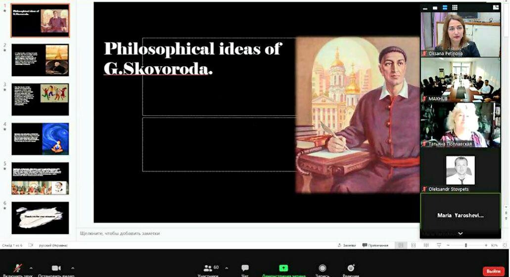 Надзвичайно порадували виступи студентів, як підготували цікаві доповіді та презентації. З української сторони найбільш яскравими були виступи: факультет іноземних мов – Notareva Anna «Life of the philosopher G. S. Skovoroda», Zherdeva Ksenia «Grygoriy Skovoroda's doctrine of cognition by heart», Gromova Daniella «Eschatological views of Skovoroda», Serebrennikova Renata «G.S. Skovoroda's doctrine about three worlds and two natures»; історико-філологічний факультет – Yaroshevich Marya «Artistic and Literary Philosophical Ideas in the Works of G. Skovorodа», Kazanzhi Alina «Ethicall teaching of G. Skovoroda and its significance for the modern», Voskoboinik Anastasia «The symbolic world of Hryhoriy Skovoroda»; соціально-