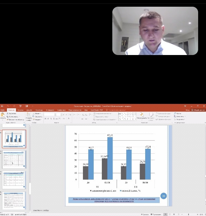 20 вересня 2022 р. на науковому (фаховому) семінарі відбувся попередній розгляд (експертиза) дисертаційної роботи здобувача 4 року навчання ОНП Фізична культура і спорт Євтушенко Олександра з теми «Удосконалення фізичної та функціональної підготовленості борців греко-римського стилю на етапі попередньої базової підготовки» (науковий керівник – доктор наук з фізичного виховання і спорту, професор Тодорова Валентина).На засіданні були присутні члени наукового семінару – професора, доценти навчально-наукового інституту фізичної культури, спорту та реабілітації, аспіранти спеціальності 017 Фізична культура і спорт та їхні наукові керівники. Експертами дисертаційної роботи виступили доктор педагогічних наук, професор, професор кафедри теорії і методики фізичної культури та спортивних дисциплін Башавець Наталія і кандидат наук з фізичного виховання і спорту, доцент, завідувачка кафедри теорії і методики фізичної культури та спортивних дисциплін Дразіна Євдокія. Під час наукового (фахового) семінару здобувач продемонстрував результати дисертаційного дослідження, відповів на запитання. У результаті жвавої і продуктивної дискусії члени наукового (фахового) семінару дійшли висновку, що здобувач повністю виконав індивідуальний навчальний і науковий плани роботи, представлена на попередній розгляд дисертаційна робота Євтушенко Олександра має наукову і практичну значущість і може буди подана до захисту у спеціалізовану разову вчену раду на здобуття наукового ступеня доктора філософії за спеціальністю 017 Фізична культура і спорт.