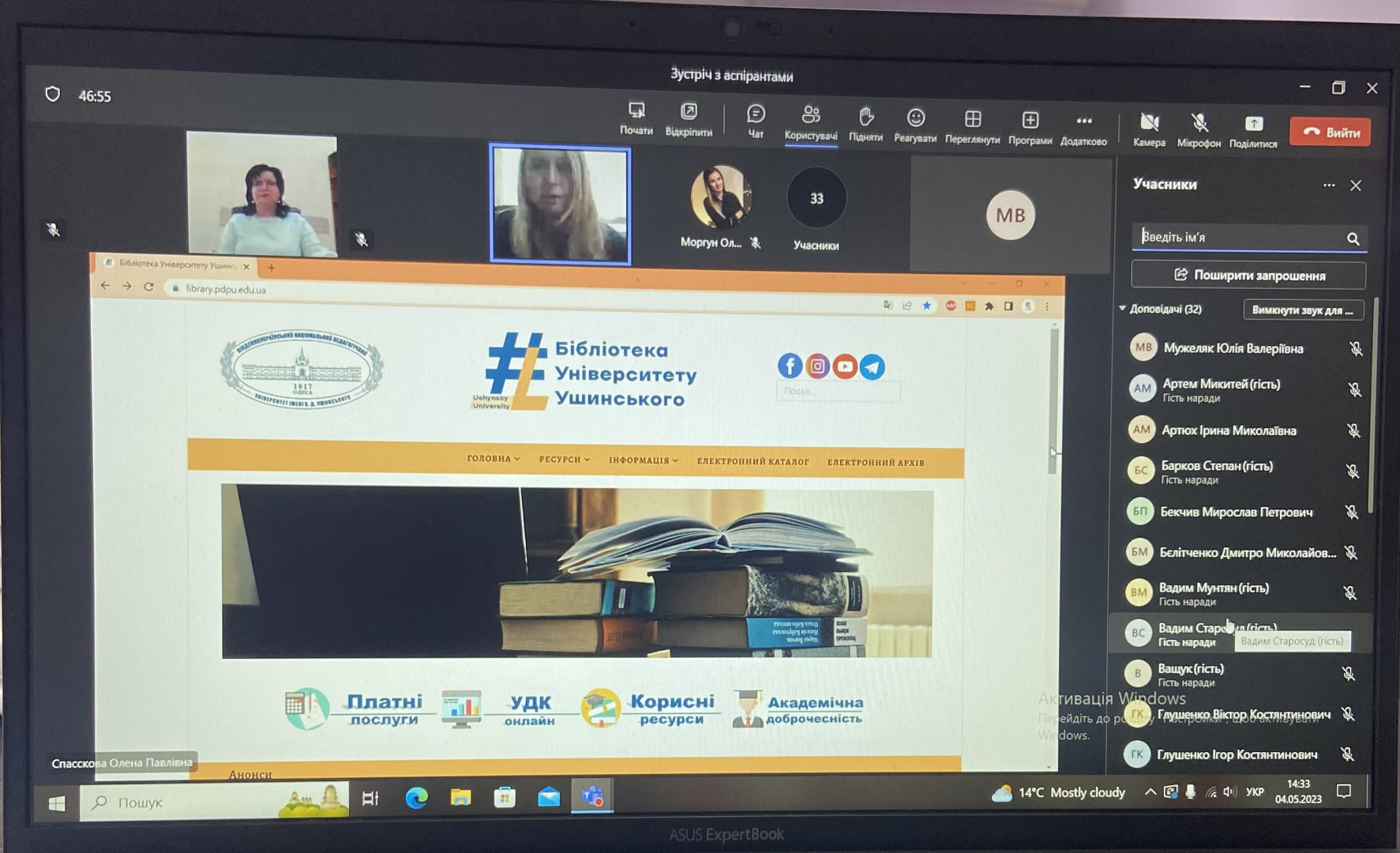 Директор Бібліотеки Університету Ушинського Олена Спасскова провела онлайн екскурсію сайтом бібліотеки, зокрема звернула увагу на питання академічної доброчесності та правила використання онлайн ресурсів бібліотеки.
