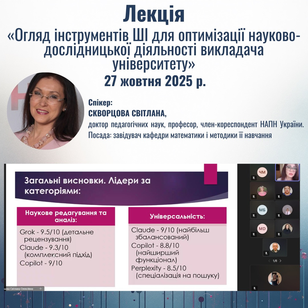 On October 29, 2025, a guest lecture by Doctor of Pedagogical Sciences, Professor, Corresponding Member of the National Academy of Sciences of Ukraine Svitlana Skvortsova was held at South Ukrainian National Pedagogical University named after K. D. Ushynsky on the topic “Review of AI tools for optimizing the research activities of a university teacher”.