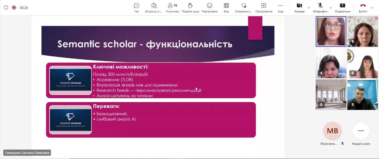 Svitlana Skvortsova introduced the participants to the capabilities of chatbots ChatGPT, Claude, Perplexity, as well as specialized platforms Google Scholar, Semantic Scholar, Cite, Elecit for searching, analyzing and systematizing scientific information.