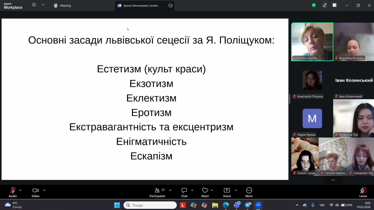 On March 19, 2026, in the group of the 3rd year of the bachelor's level of education, specialty 014.01 Secondary Education (Ukrainian Language and Literature) of the Faculty of History and Philology of Ushynsky University, in the class on "History of Ukrainian Literature" (Associate Professor Avksentieva G. A.), a guest lecture was held by I. V. Nechytaliuk, Candidate of Philological Sciences, Associate Professor of the Department of Ukrainian Literature and Comparative Studies on the topic "The Modernist Group "Young Muse": an aesthetic component". The lecture presented thorough material on the peculiarities of the formation and development of the modernist group "Young Muse", the originality of the aesthetic principles and programs of the community, the bright figures of the writers of this literary organization, the artistic specificity of their creative work. The guest lecture aroused a range of sincere scientific interests, revealed in subsequent comments and discussions of education seekers, which testified to the deep scientific and practical potential of this type of cooperation between different higher education institutions and the favorable experience of exchanging educational material.