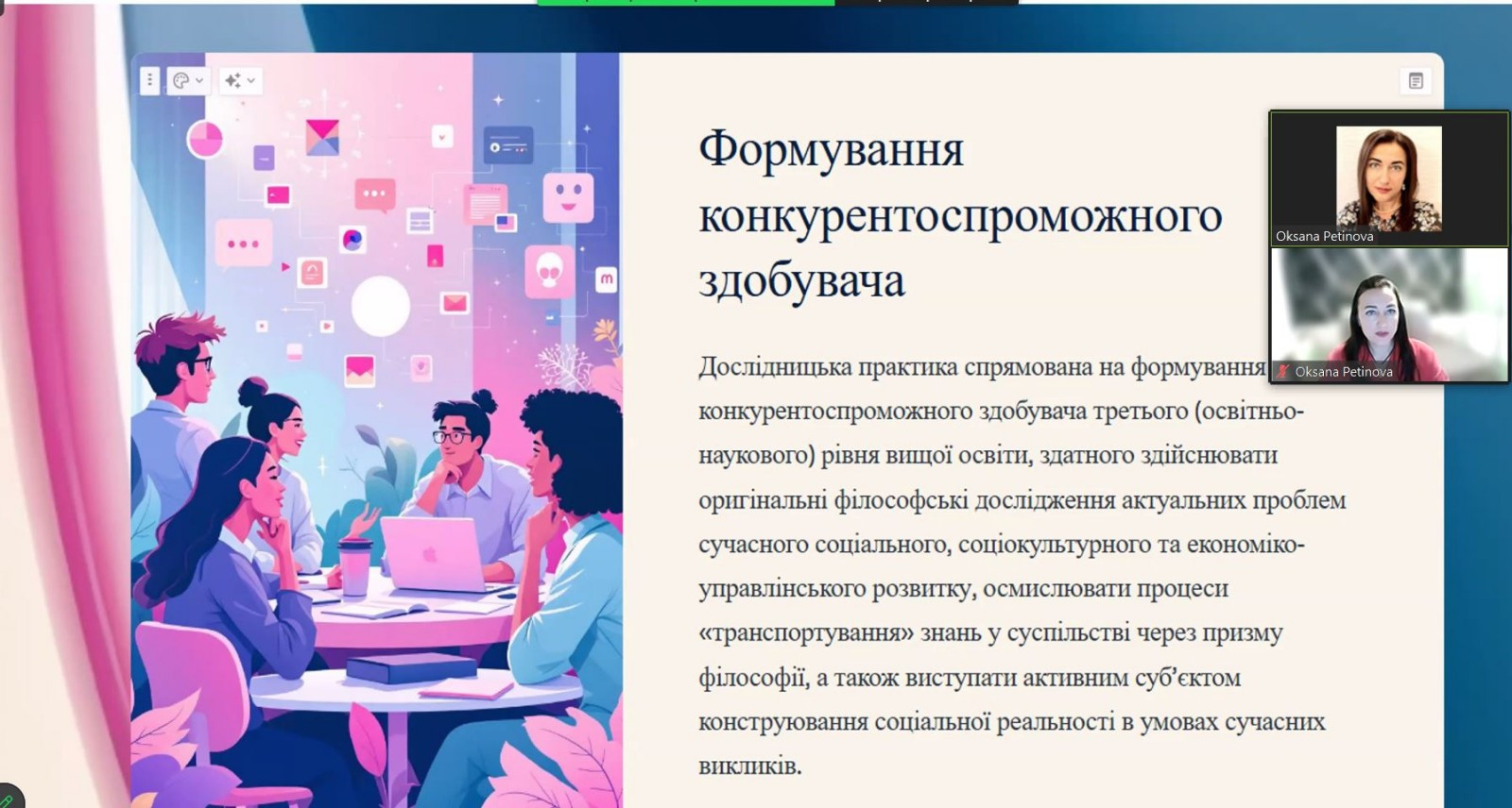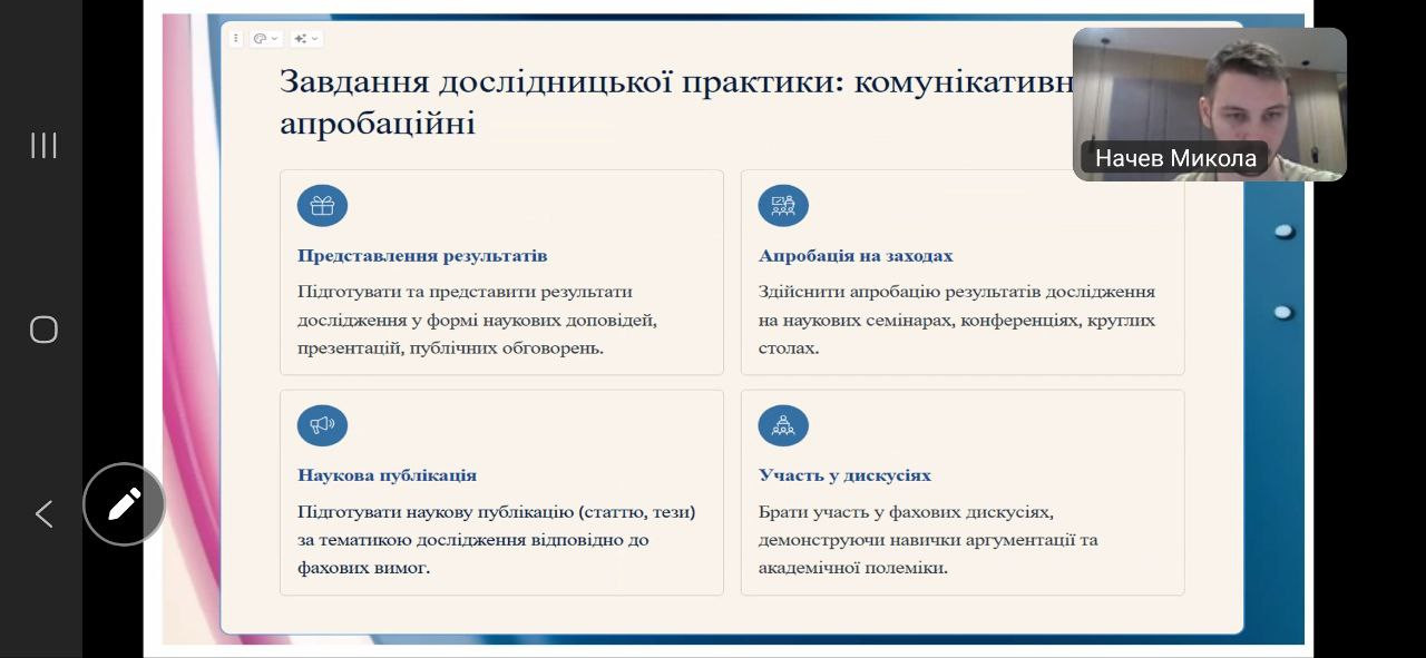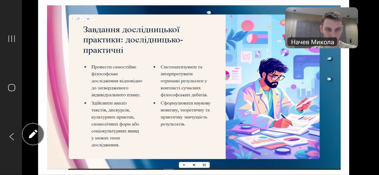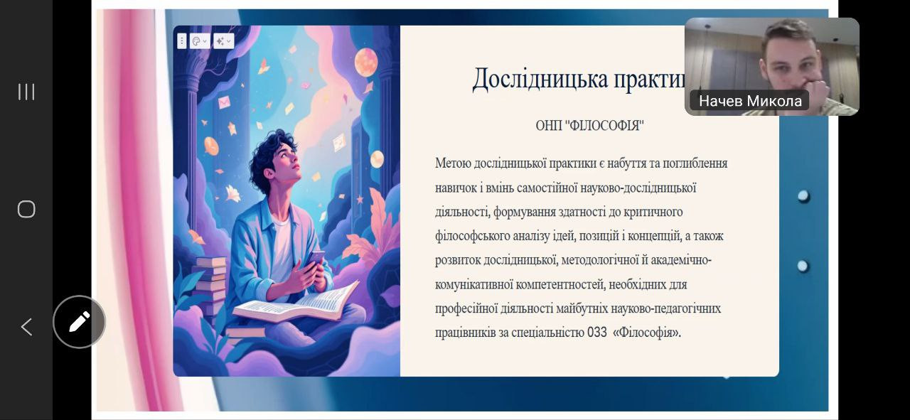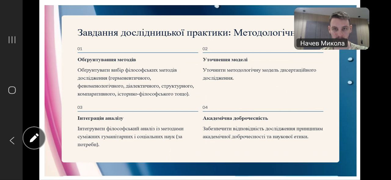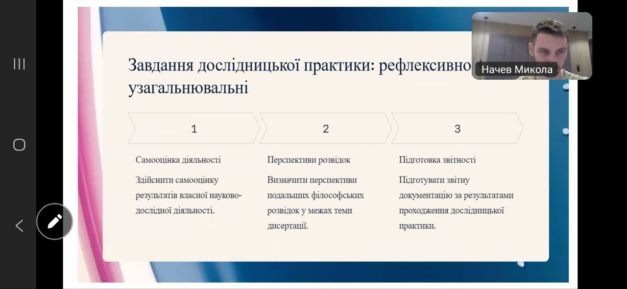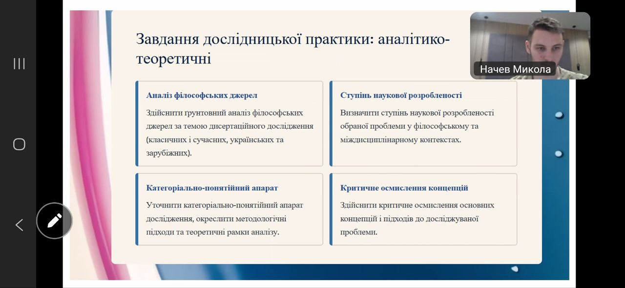 Відбулася настановча конференція з дослідницької практики для здобувачів третього (освітньо-наукового) рівня вищої освіти за освітньо-науковою програмою «Філософія». Захід став важливим етапом організації та методичного супроводу науково-дослідної діяльності аспірантів у межах їхньої професійної підготовки. Зустріч провела Гарант ОНП проф. Оксана Петінова.